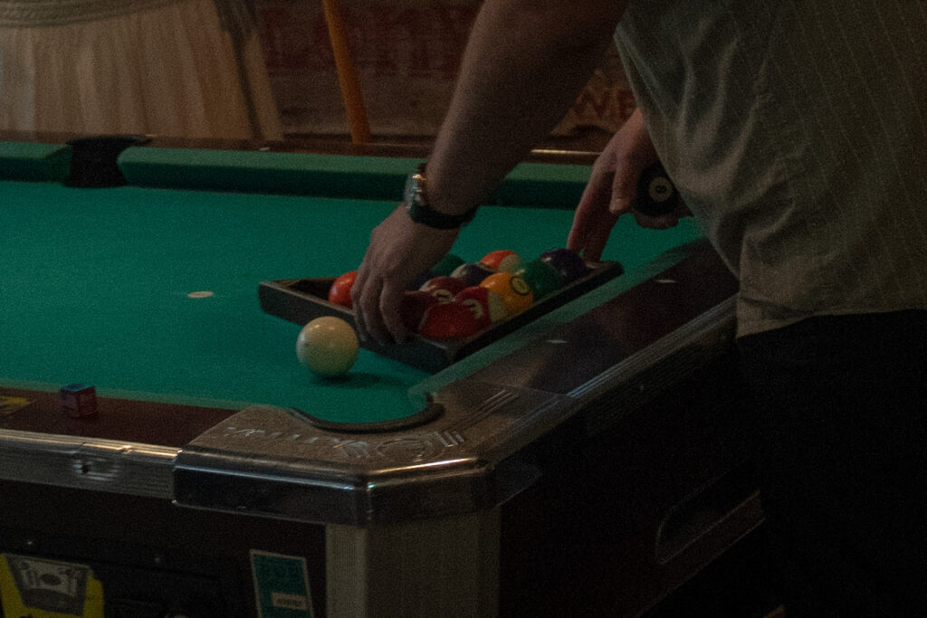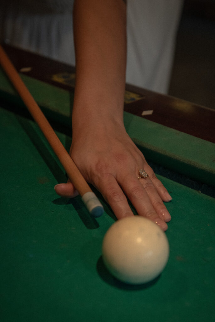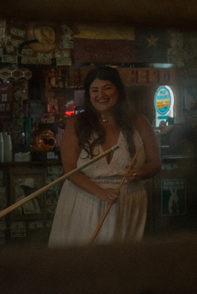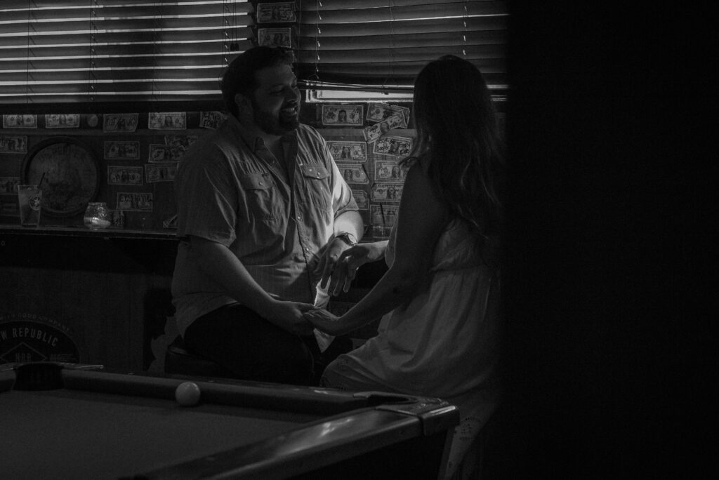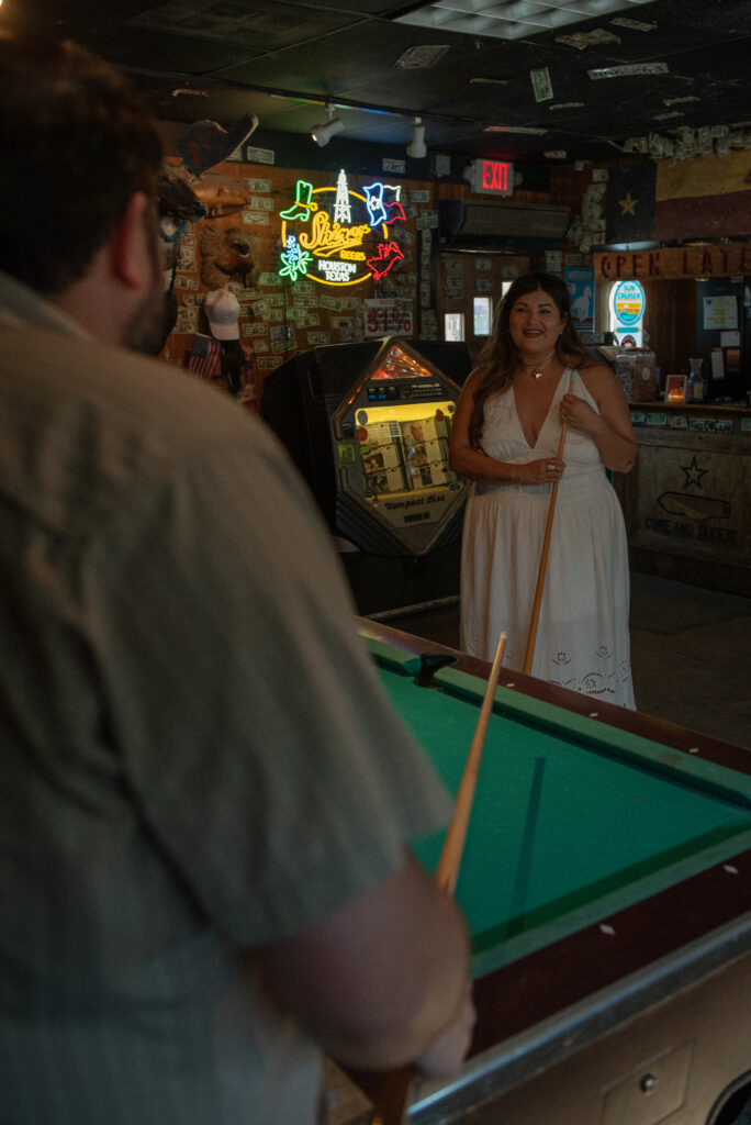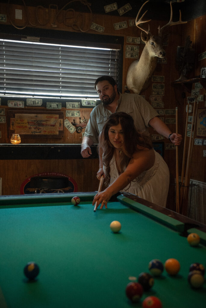 Dive bars have their own kind of magic. The warm glow of overhead lights, the hum of music in the background, the soft clink of pool balls breaking across the table. It’s intimate, unposed, and cinematic, and it gave Liz & Austin the perfect backdrop for a date-night style session.
