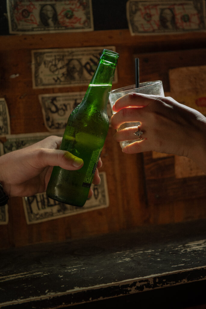 There is something electric about photographing a couple in a space that feels completely natural to them, and Liz and Austin’s engagement session inside a cozy Houston dive bar was exactly that. Forget the traditional outdoor golden-hour vibes. These two wanted something real, something moody, something that felt like their actual relationship — which meant beers, dim lighting, neon signs, and a few competitive rounds of pool.